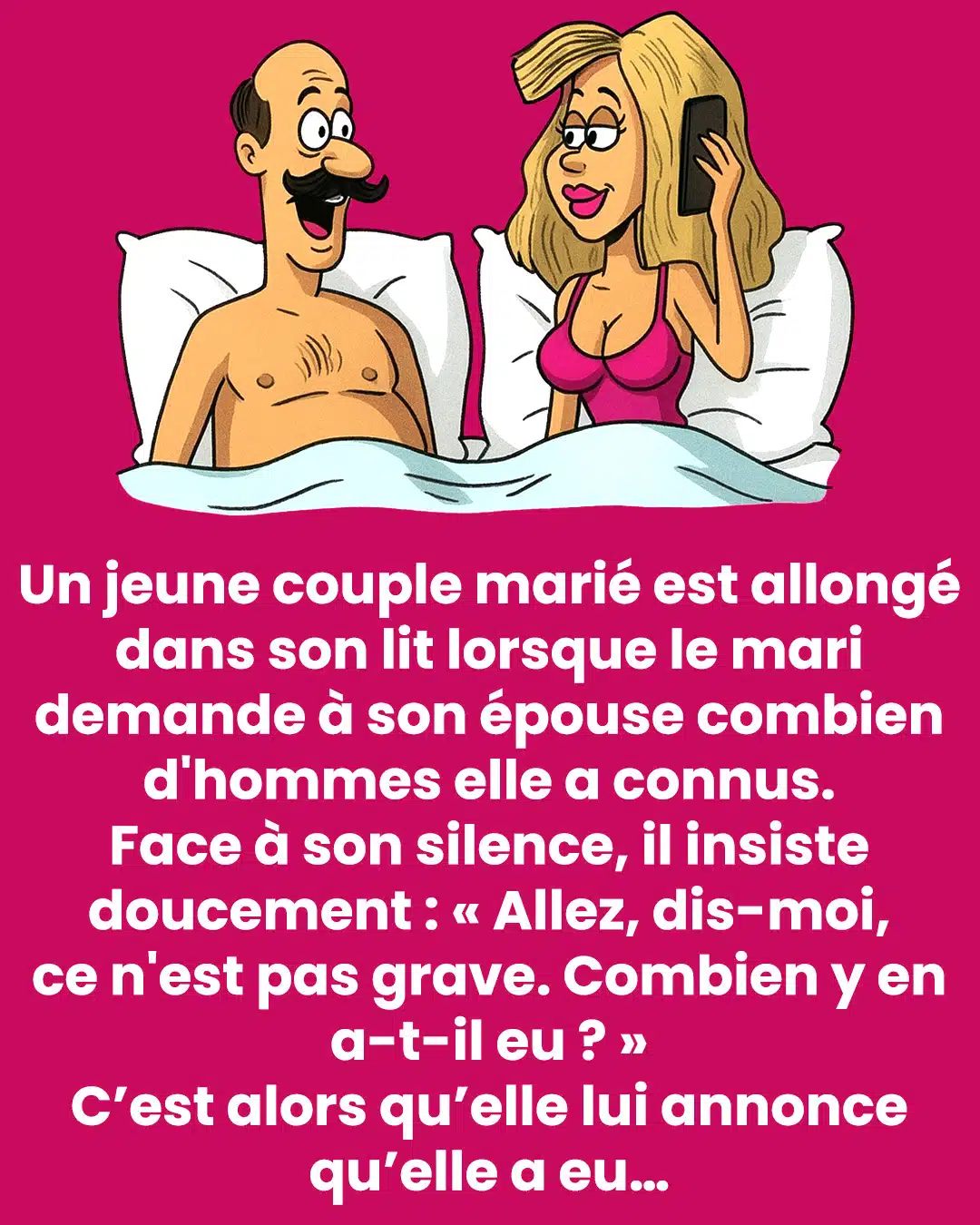 La femme ne bouge pas. Son regard reste fixé au plafond, l’air profondément concentré. Un silence s’installe, un peu pesant. Mais le mari, persuadé qu’il s’agit là d’une conversation de confiance, insiste :